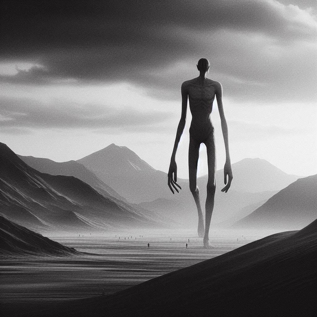 It had taken no longer than the passing of six hours or so for their satchels of salt crystals to hang empty, each member standing more straight and stepping with deeper insight and gratefully partaking the quench of one another’s perspirations once more. They keep on like this for twice as long, eventually coming to the end of the battlefield and back into open plains and vastness. Sand dunes roll delicate across the distance, fading back and forth between course yellow and fine white, and obscuring the silhouetted mountain ranges protruding the concave of the foreground; casting their omnipotence against the open landscape like some sort of border wall for this continent and the one beyond. And between the mountains and here, a giant walks aimless in the distance; dust plumes beneath its long slender legs, clouding upward to its low hanging clutches. It resembles a man of great hunger, and stands taller than the mountains beyond. Its presence is unsettling, featureless beneath the sun and its skeletal frame is almost visible from where they are standing. They trek on, keeping the giant to their right as a constant reminder of where they stand in this new world. After a while the towering man stops dead in its tracks, then lets out a scream not unlike that of a trumpet which rumbles the air around them. The winged shadows break formation, drawing across the meridian of day. Time stands brief, it covers its head with hands much larger than they should be, and sobs most disgustingly hollow. Then, the ground beneath them quakes in delay as it stomps in a fit of rage and confusion, afterwards it stops, turns around and heads back where it came from, eventually disappearing beyond the horizon, its howling cries echoing still now and again through the empty air.