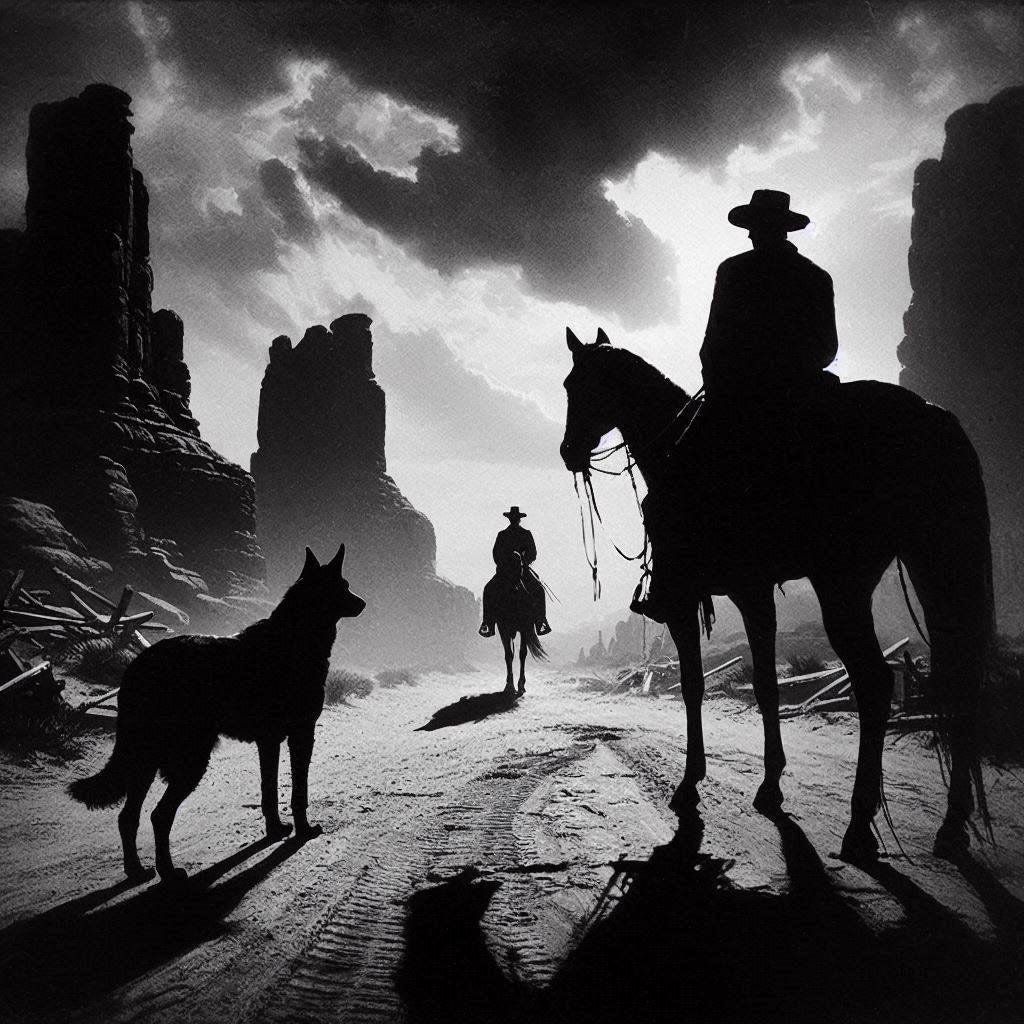 Butch rides ahead, galloping steady against the wind. He draws closer and the figures begin to take form, making themselves out to be what appears as a man riding horseback, beside him, a dog.